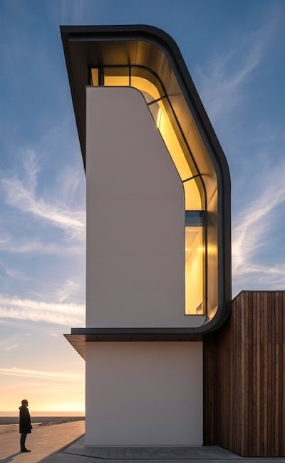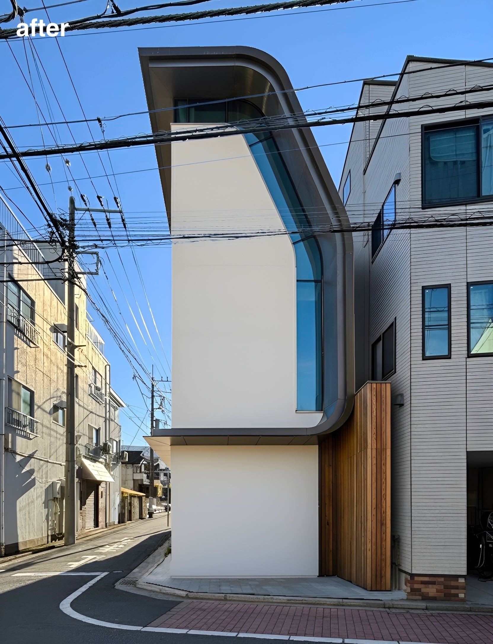 特に、ファサードの湾曲したガラス窓は、外部からの視線を緩やかに逸らしつつ、内部の生活空間に均質な光を取り込むための光のフィルターとして機能します。