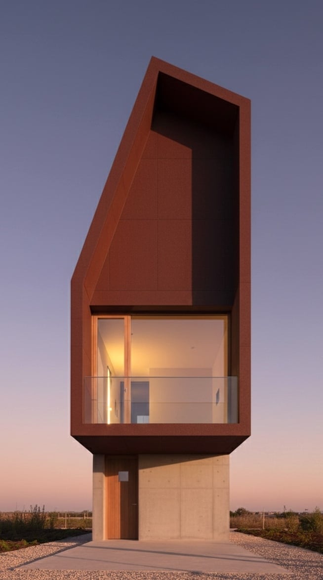 建物を包み込む深紅の特殊な外装材は、太陽の光を受けて陰影を刻み、時間帯によって異なる表情を見せます。