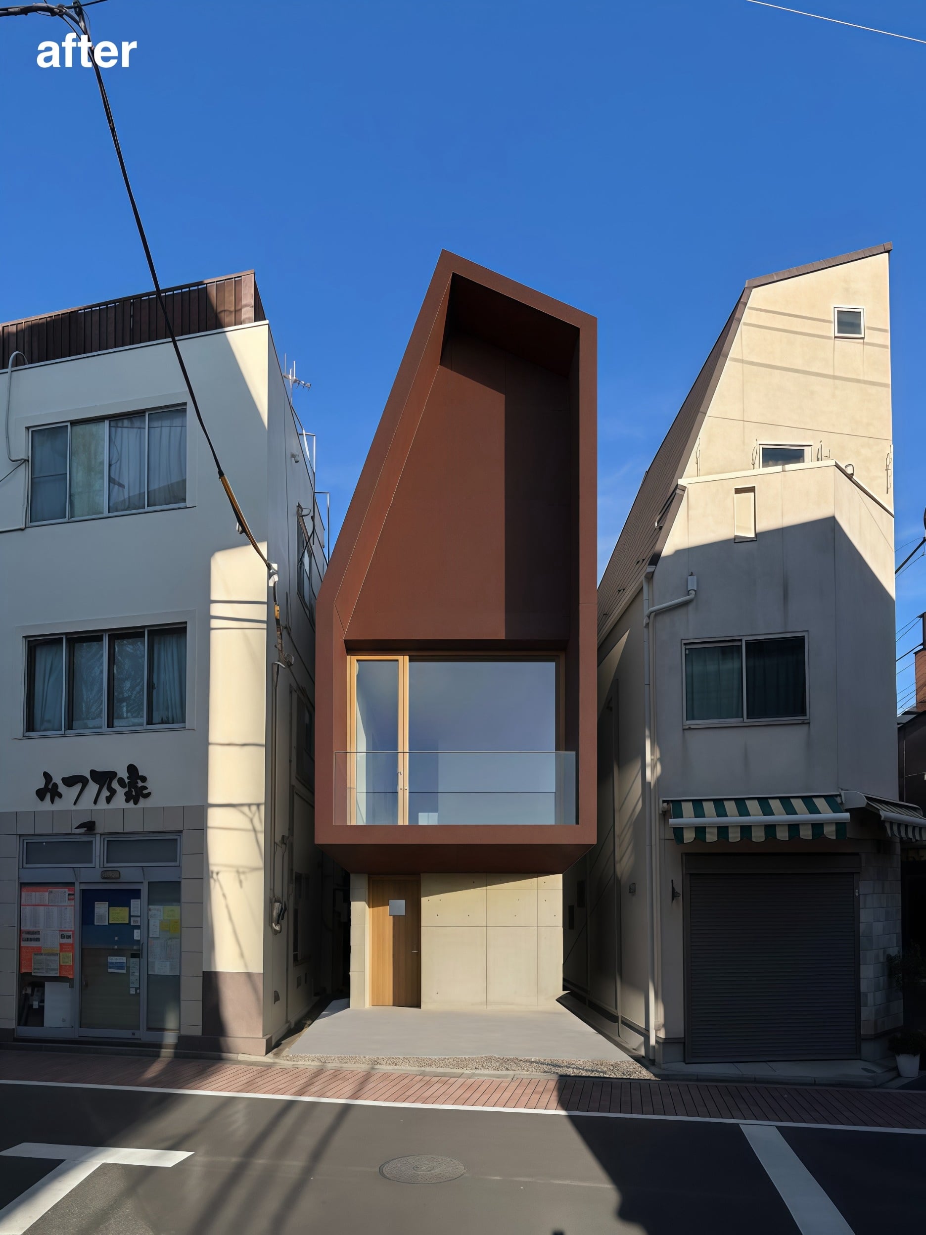 1階のコンクリートの基壇と控えめな木の玄関扉が、重厚な上階のボリュームを引き立てます。