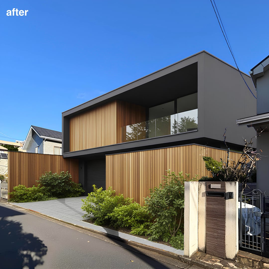 縦のラインを強調した板張り壁は、建物にリズムと奥行きを生み出しています。