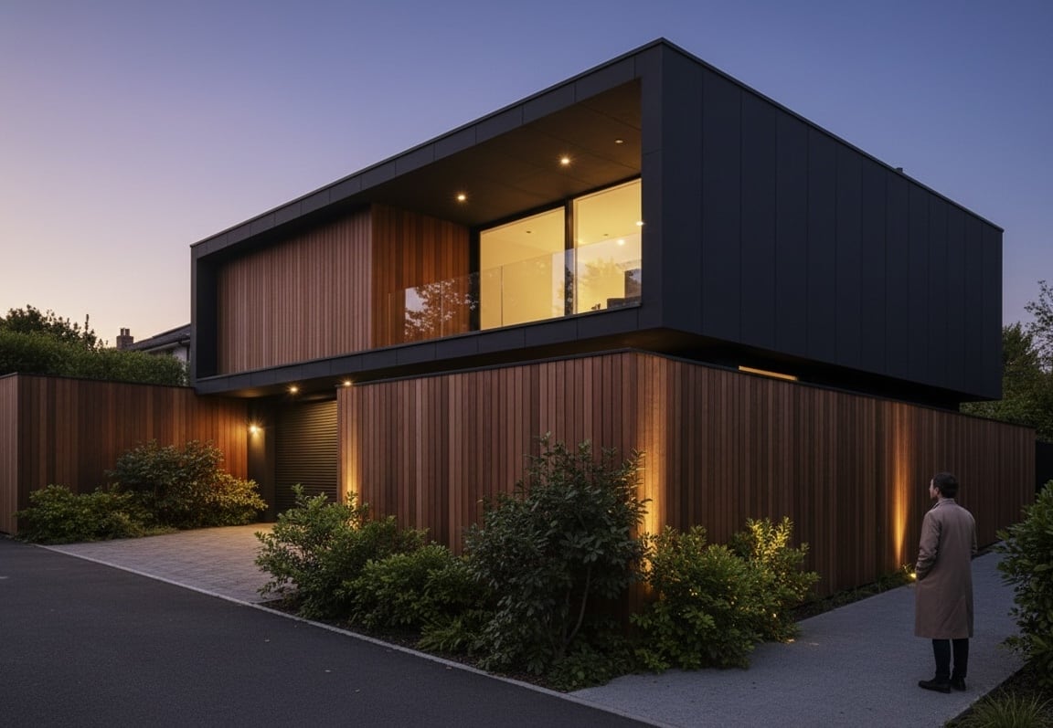 建物の外観は、マットなダークグレーのボリュームと、暖かみのある木製ルーバーをまとったボリュームの二層構成となっています。
